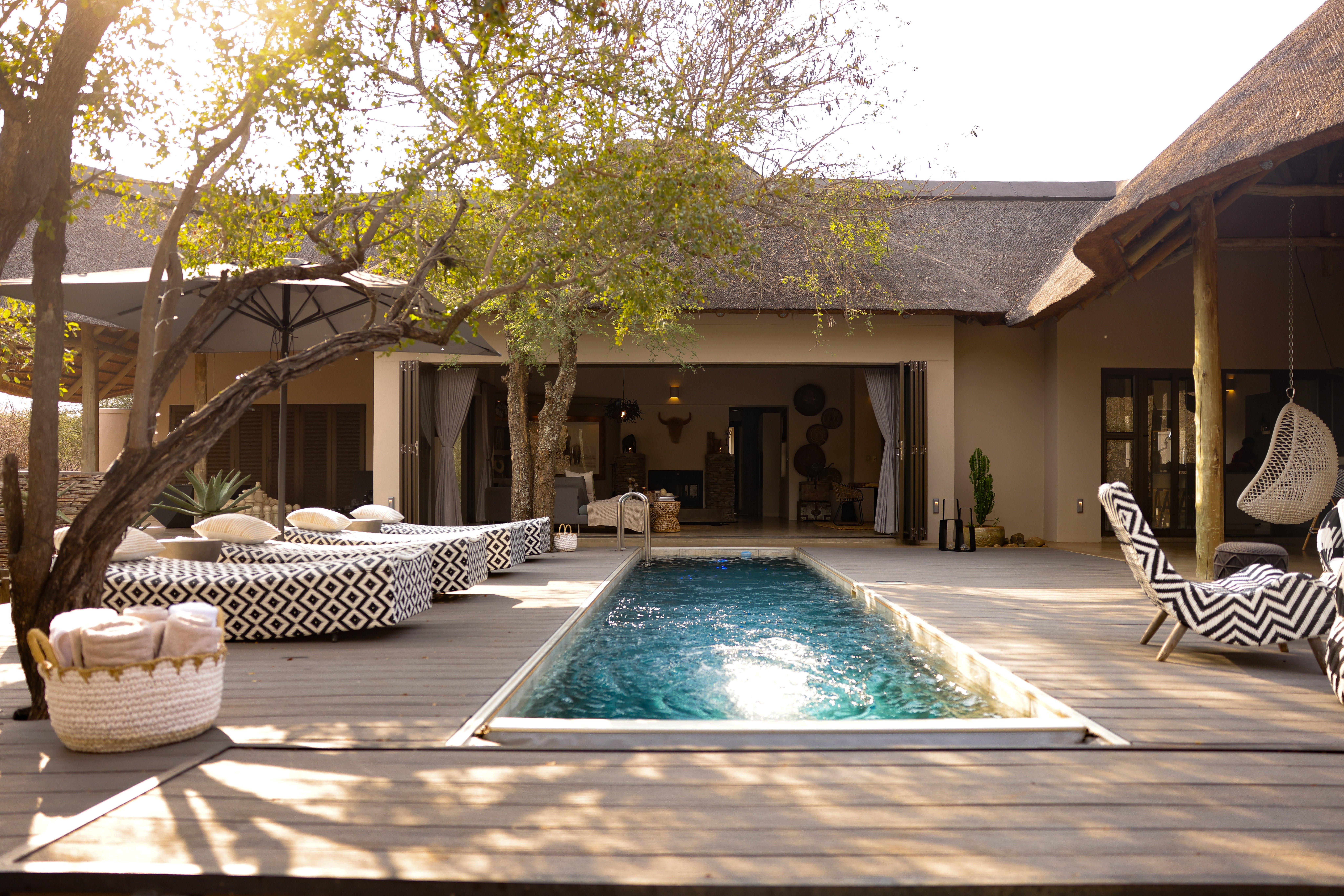 Binnen de villa heerst een warme, ruime sfeer, ontworpen voor gemakkelijk samenleven. Na een dag de bush te hebben verkend, biedt de open woonruimte een gastvrije plek om te ontspannen en tot rust te komen. Gasten kunnen zich terugtrekken in de woonkamer of samenkomen rond de eettafel, met zowel binnen- als buiteneetmogelijkheden om van maaltijden te genieten in een setting die bij het moment past. De villa beschikt over vier comfortabele slaapkamers, strategisch geplaatst in verschillende delen van de villa om ruimte en privacy te bieden aan elke gast. Elke slaapkamer heeft een eigen badkamer - met zowel een binnen- als een buitendouche - en een privéterras, wat een rustgevende plek creëert om je terug te trekken tijdens het reizen met elkaar.